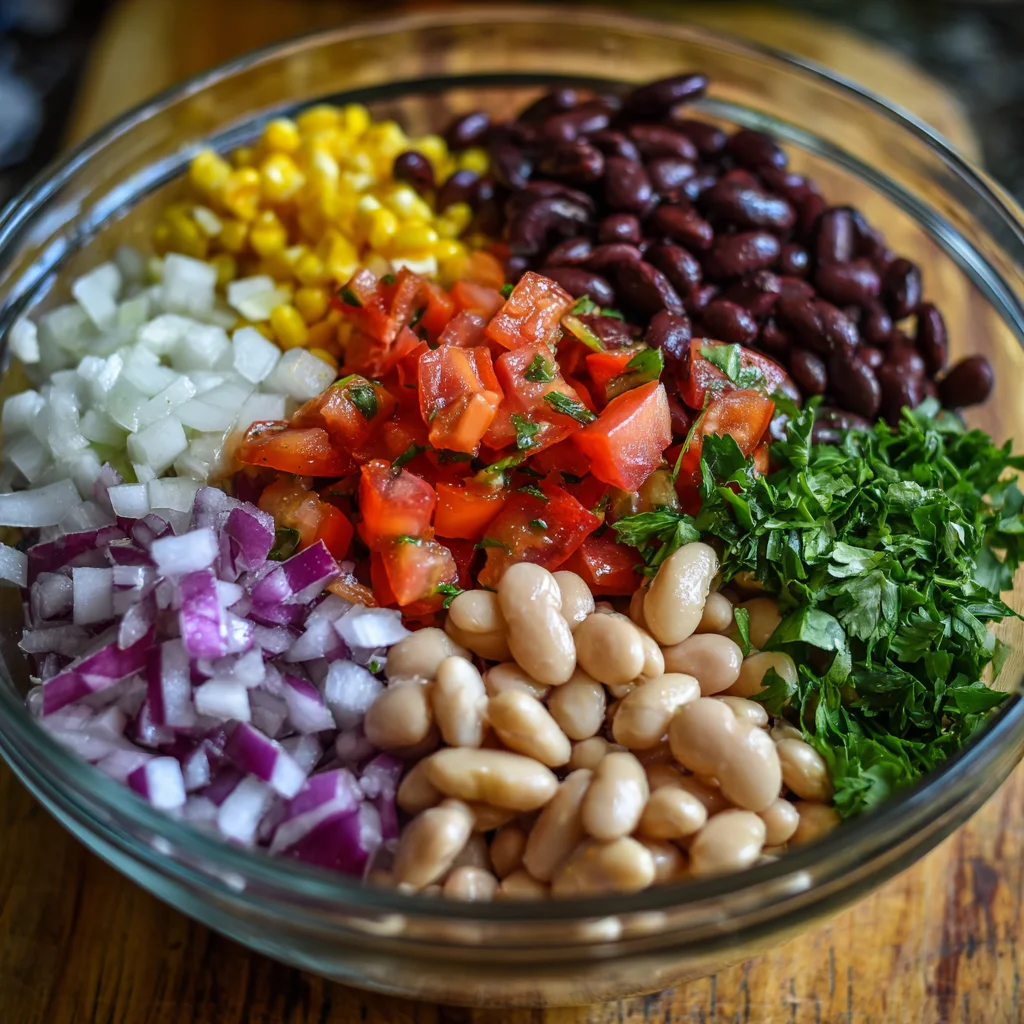 In a large mixing bowl, combine the black beans, kidney beans, and sweet corn (ensure they are all well-drained). Add the diced red bell pepper, finely diced red onion, and chopped cilantro. If using, add the halved tomatoes now.