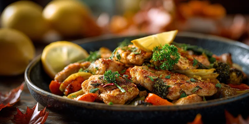 Add minced garlic, thyme, and rosemary. Sauté briefly until fragrant, about 30 seconds. Deglaze the pan with chicken broth or apple cider, scraping the bottom to lift all those flavorful bits. Return the chicken to the skillet, nestling it among the vegetables. Cover and reduce heat to low. Let everything simmer for 10–12 minutes until the chicken is fully cooked and the veggies are tender.