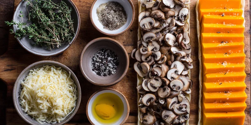 - Roast Squash: Toss squash with 1 Tbsp oil, wpzoom-recipe-card/block-recipe-card/4$ tsp thyme, salt/pepper. Roast at 0^circtext{F}$ for 20–25 mins until tender.Sauté Filling: Heat butter and remaining oil. Add mushrooms; cook until liquid evaporates and they are golden (8–10 mins). Add shallots, then garlic and remaining thyme; cook 4 mins. Season well.Prep Pastry: Unroll pastry on parchment-lined sheet. Score a 1-inch border. Prick the center with a fork (docking).Assemble & Bake: Mix squash into the mushroom filling. Spread the grated cheese over the pricked center of the pastry. Top with the filling mixture, staying inside the border. Brush the border with the beaten egg wash.Bake at 0^circtext{F}$ for 20–25 minutes until the crust is golden and puffed. Cool 5 mins before slicing.